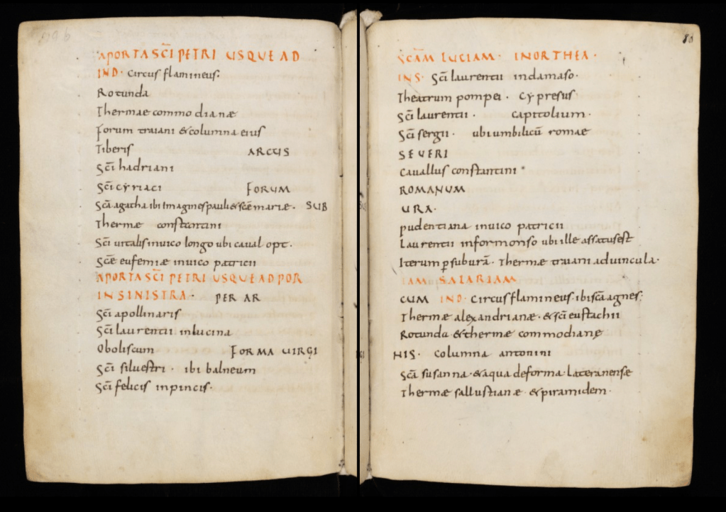 The same view also underlies textual representations of cities and the world. When I was writing this blog, I was studying the Itinerarium Einsidlense, a Carolingian collection of twelve walking routes (‘itineraries’) through Rome. It is transmitted once, in a ninth-century Carolingian manuscript from the Stiftsbibliothek Einsiedeln (fig. 5), which was most likely made in the ninth century in the Abbey of Reichenau (situated on an island in what is now called Lake Constance). The Itinerarium is a remarkable text, not least because of the form in which the routes are presented in the manuscript. The itineraries do not contain running text, but consist of lists of monuments, which are written in three columns at the left, right, and in the middle of the double page (‘bifolio’). The placement of the columns corresponds to the place where the traveler would see the monuments while walking through Rome: at the left- or right-hand side of the road, or—when s/he has to cross a square such as the Forum Romanum or a triumphal arch such as the one of Severus—in the front. The headings in s[inistra] (‘left’) and in d[extra] (‘right’) emphasize the location of the monuments in space, while titles in red capital letters (‘capitalis rustica’) indicate the beginning and end of the itineraries.