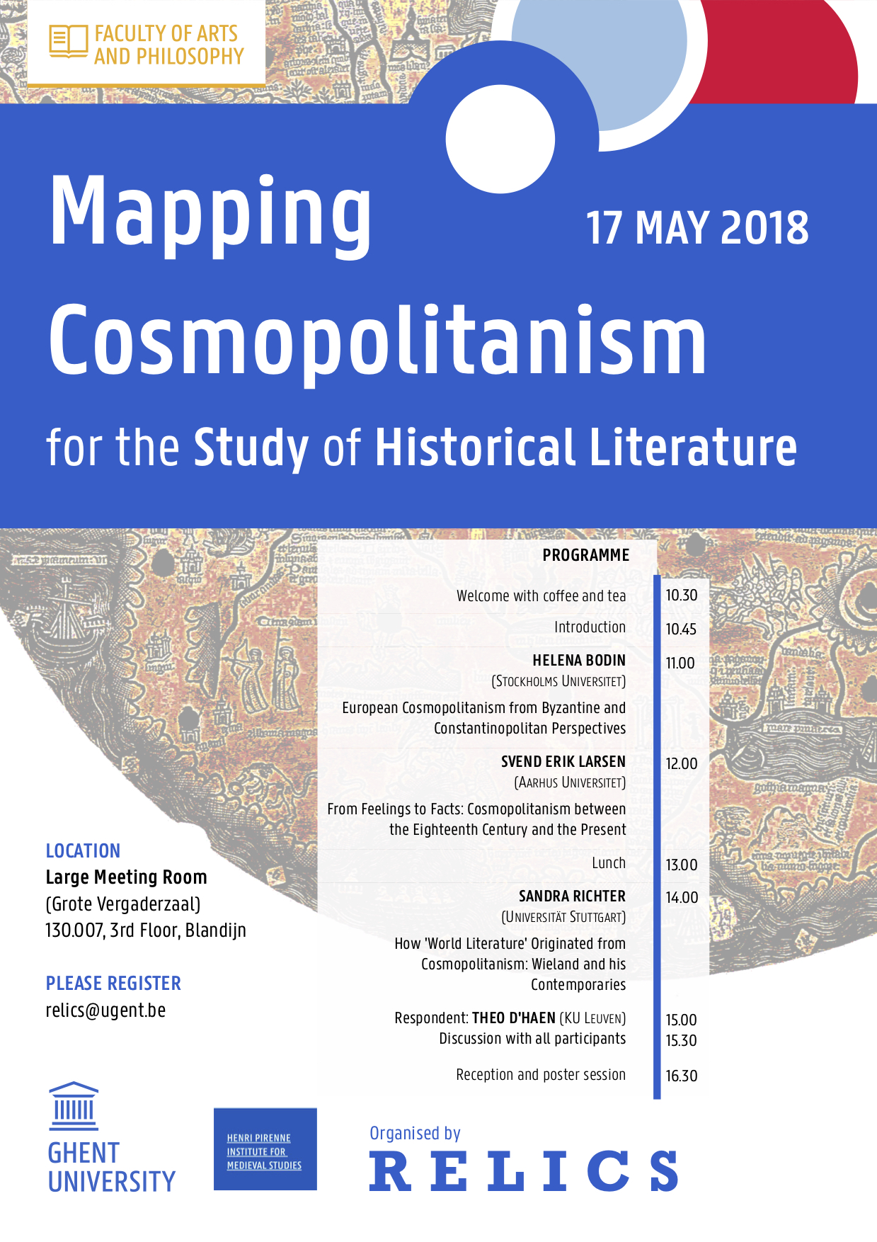The spring meeting of the new research group RELICS is devoted to the concept of cosmopolitanism: how has the concept been interpreted before and how can we shift its course in order to make it more valuable for the study of historical literatures and European identity? In this workshop, we consider ‘cosmopolitanism’ as a ‘travelling concept’. This term alerts us to the dynamic and changeable nature of concepts as they travel back and forth between diverse academic contexts, and their ability to change the very objects they analyse (Bal 2002, Neumann en Nünning 2012). We want to map out the travels of ‘cosmopolitanism’ in academic discourse to see how it might transform our view of the history of European literatures.